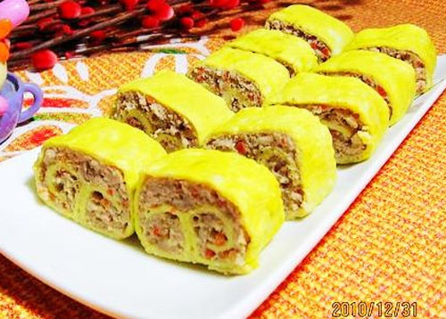2、肉馅要细一点,做出来的蛋卷切口才平整。