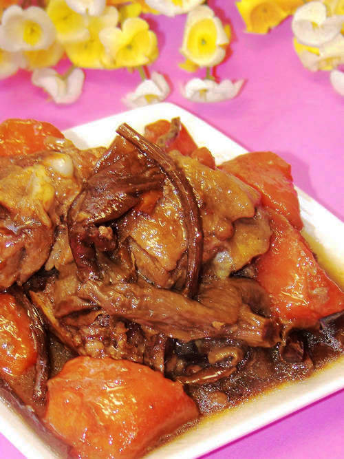及以下步骤:茶树菇泡好,洗净切段。 胡萝卜切滚刀块。 鸭肉焖熟后加盐。 倒入胡萝卜块。 继续加入茶树菇一起煮。 胡萝卜和茶树菇熟后,加入老抽上色,就可起锅了。 鸭肉焖熟后加盐。 倒入胡萝卜块。 继续加入茶树菇一起煮。 胡萝卜和茶树菇熟后,加入老抽上色,就可起锅了。