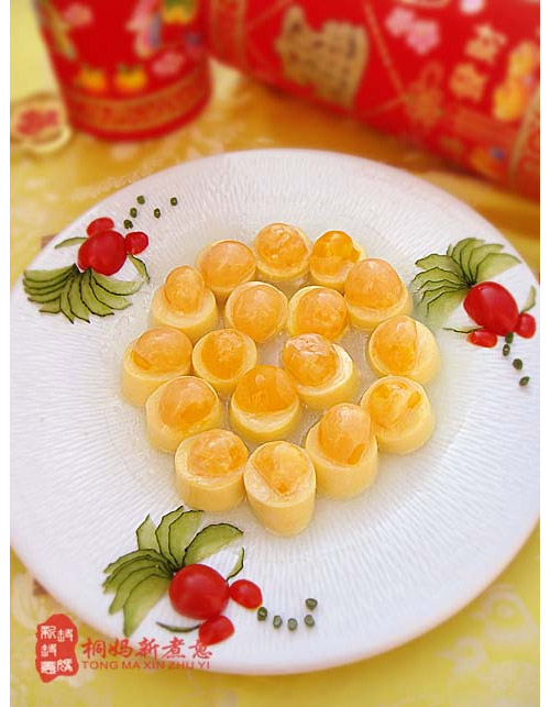 在节日的餐桌上,人们大鱼大肉大快朵颐的同时,也应佐以清淡的菜式,这道黄金软玉便是典型的清淡口味。此菜以咸蛋黄为金,玉子豆腐为玉,再配以金鱼(金玉)围边,相互呼应,寓意金玉满堂。口味清淡,造型可爱,不仅大人喜欢,也十分讨小孩子喜爱。