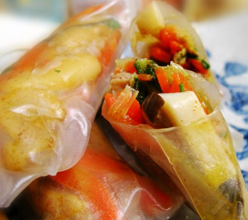 四道菜终于做到了最后一道——吉祥如意。 吉祥一词,最早出于《庄子》,原文不记得了,但是依稀记得有人曾注释说吉者,福善之事;祥者,嘉庆之徵。心存善念,广行福德,方以吉祥嘉庆吧。 至于如意,除了称心如意之意外,更多的是从古代印度传来的那种法器吧。玉如意,象牙如意,珐琅如意等等,儿时关于玉如意的最早记忆,还是来自西游记中观音大士手持的法器。长大了才知道,看似很神秘的佛具,居然是痒痒挠的前辈…… 最后一道菜,吉祥如意,做了四合如意卷,送给各位朋友以及各位家中的小朋友们。 晶莹糯米春卷皮包裹了4种馅料,长长的做成如意法器的形状,是为四合如意卷。 不爱吃菜的小朋友们,把菜包在春卷儿里,用手抓着吃,一个比一个吃得欢啊,呵呵。 2011年的第一天,祝各位大朋友小朋友们——新年快乐!吉祥如意!