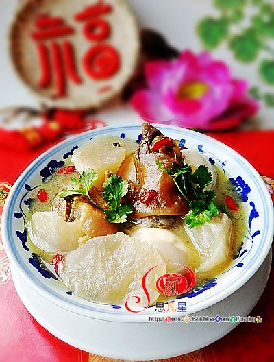 总决赛d组,招财进宝篇---腊猪手煲萝卜(加蛋精髓版)。入冬来一直在做各种腊味准备过年享用,腊了副猪手好似特意为决赛准备的,相信每家的年夜饭里都也少不了炖(煲)猪手啦,猪手意为招财进宝嘛,中国五千年的文化真是博大精深! 平常猪手都喜欢用新鲜的,一般炖黄豆啦、萝卜啥的,腊味的猪手您吃过吗?腊猪手煲萝卜再加上煮熟的鸡蛋(意为元宝),非常好吃的咸鲜味加上萝卜的清甜,那味道真是年味儿十足啊!非常非常值得推荐的一道年夜菜! 此菜特点:咸鲜味美、香味扑鼻而来,传统的腊味配上传统的青花瓷大碗,真有一股大块吃肉、大碗喝酒的冲动!再加上中国味十足的中国结背景,给您味觉享受的同时也满足了你视觉上冲击! 祝大家新年发发发!