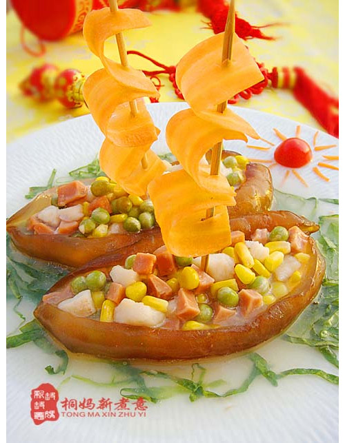 及以下步骤:海参去除腹内肠脏,洗净,放入加有姜片、料酒的滚水中焯一下捞起。 再放入蒸锅中大火蒸8分钟后取出,汤汁留用。 锅烧热放油,爆香姜末。 下入鱼肉快速滑炒后装起。 将锅洗净放油,下火腿丁翻炒数下。 再放入青豆和玉米翻炒。 放入鱼肉。 炒匀,加适量盐,鸡精调味后装起。 将蒸好的海参放入盘内,炒好的鱼米放入海参中间。 淋于海参船上,插上胡萝卜片作成的船帆即可。