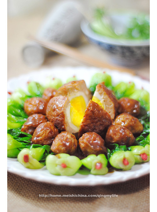 这道菜灰取名为【合家团圆蛋】,被我同事笑了半天,她建议我把蛋字去掉,我还是保留下来了,因为发帖的今天是元旦节嘛,圆蛋取个谐音,凑个元旦节的热闹。中国人过节,最重要的就是一家人的团圆,什么山珍海味也比不上节日里亲人的团聚来的重要,因此圆子就成了中国人春节里一道不可缺少的菜,象征的团圆的无限美好,也寄予了人们对团圆无尽的期待。 这道菜明眼人可能一眼就看出来了,其实就是有肚子里很有货的狮子头+虎皮鹌鹑蛋。这次我将这两个菜同时一起做,既品尝了2种风味,也给这道团圆菜带来了更多的寓意。 这个狮子头用微火焖约三十分钟,因此吃起来肥而不腻;虎皮鹌鹑蛋吸收了加了鲍鱼汁的红烧酱汁,外焦里嫩,十分的鲜美可口哦。不管是待客还是自家人吃,都是一道绝对上的了台面的菜。