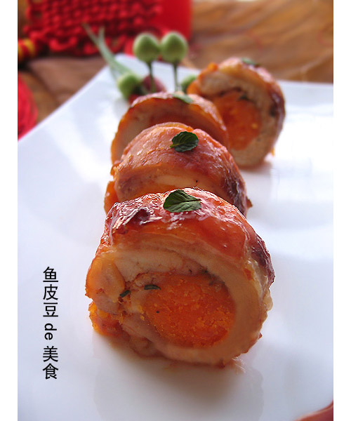卷蛋黄时,要把蛋黄放在鸡腿的一端,卷紧。这样蛋黄刚好在肉卷的中间,形似古钱币。