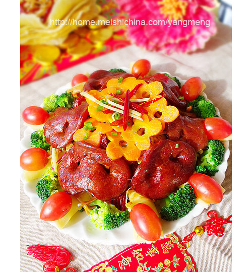 这道蚝皇一品香,因猪鼻形似如意,西红柿谐音事,用九个摆放,有长长久久万事之意,所以整道菜体现了万事如意的寓意。 这道菜的采用了老家特色菜佛门一品鲜的做法,风味独特,鲜香味醇,摆盘美观,是酒席家宴中的镇桌之菜。猪鼻熟制后,质地挺韧而富弹性,耐咬嚼,富胶质,滋感独特,深受人们喜爱,并认为是猪肉中的最佳部位。用上等蚝油烧出来,更是口感鲜香,配上酥香的辣椒和馓子,就取名一品香。 吃的时候,用金黄的玉米饼卷上酥香的辣椒、馓子、姜丝,放几片红润劲道的蚝汁猪鼻,口感丰富回味无穷。