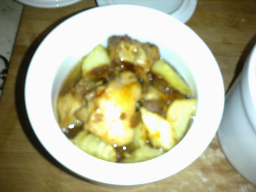 4、取炖盅,葱姜垫底,将炸好的土豆和鸡块均匀的码放,取一小碗,将一勺甜面酱、一勺黄豆酱、一勺腐乳汁、以及少许食盐搅匀调味,把调好的酱汁浇入炖盅,然后往盅里加开水,加至材料的二分之一到三分之二处即可(根据喜好)