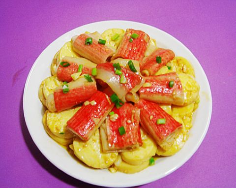 及以下步骤:倒入蟹柳,倒入用鲍汁、盐、生抽、水淀粉和鸡粉调成的味汁略煮片刻。 放入葱花轻翻即可上碟。(小心将豆腐码放在碟底,蟹柳摆放上面,放上葱花即可)。 玉子豆腐切成厚片。 姜蒜切末,葱切花。 蟹柳入放了料酒的滚水里略烫捞出备用。 锅里放油爆香姜蒜末。 放入玉子豆腐轻轻晃动锅子让豆腐平铺锅底略煎。 锅子晃动将豆腐翻个面再煎使豆付成形。 倒入蟹柳,倒入用鲍汁、盐、生抽、水淀粉和鸡粉调成的味汁略煮片刻。 放入葱花轻翻即可上碟。(小心将豆腐码放在碟底,蟹柳摆放上面,放上葱花即可)。