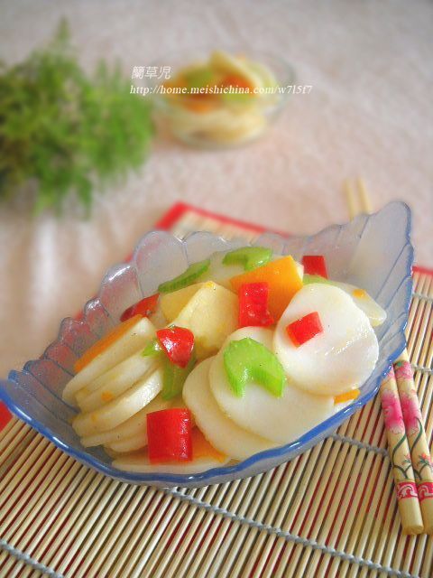 及以下步骤:准备好食材。 年糕切好片;用开水烫一会,沥干水分。 准备好食材。 年糕切好片;用开水烫一会,沥干水分。 准备好食材。 年糕切好片;用开水烫一会,沥干水分。 苹果、南瓜、红椒、西芹分别洗净切片备用。 锅中油热,下西芹、南瓜翻炒。 倒入年糕;加盐、胡椒、生抽,炒匀。 倒入苹果、红椒,炒匀;调好味即可装盘。