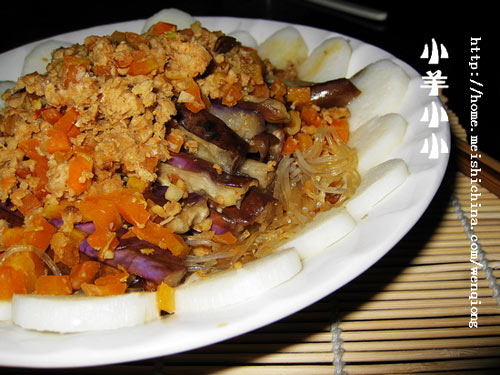 这道菜肴本来是跺脚粉丝蒸茄子,因为小朋友的关系,所以浇汁改成肉末和胡萝卜,而且加了淮山。
