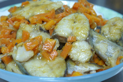 及以下步骤:转小火焖至汤汁差不多收干即可盛起。 马鲛鱼洗干净切1.5厘米厚块,淋少许白米酒,腌几分钟,清除余液,抹上细盐。 铺上薄薄一层面粉。 马鲛鱼洗干净切1.5厘米厚块,淋少许白米酒,腌几分钟,清除余液,抹上细盐。 铺上薄薄一层面粉。 热锅放适量油,一片片放入锅内,猛火煎1分钟后转小火,煎至焦香泛黄,转面如法煎制。 胡萝卜切粒,下油锅中翻炒。 加入少许盐、米醋、糖、蕃茄沙司及清水,盖上锅盖烧开。 将煎香的马鲛鱼块倒入烧开的汤汁中去。 转小火焖至汤汁差不多收干即可盛起。