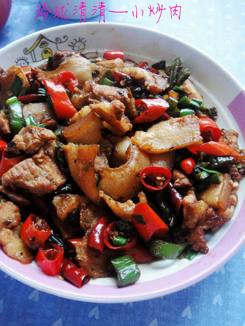 及以下步骤:放入青红椒翻炒。 辣椒炒出味道后,放入五花肉翻炒。 加生抽、老抽、盐,喷入一汤勺热水,加点糖提鲜,最后加少许鸡精,关火后撒入葱绿,炒匀出锅。 姜蒜切碎,葱白葱绿分别切碎。 锅里放少量油、将五花肉皮一片片地放入,两面煎熟。 两面煎熟后再翻炒,盛起待用。 锅中留底油,爆香姜蒜、葱白、朝天椒。 放入青红椒翻炒。 辣椒炒出味道后,放入五花肉翻炒。 加生抽、老抽、盐,喷入一汤勺热水,加点糖提鲜,最后加少许鸡精,关火后撒入葱绿,炒匀出锅。