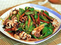 6、章鱼炒香后,加入姜丝,辣椒一起煸炒。