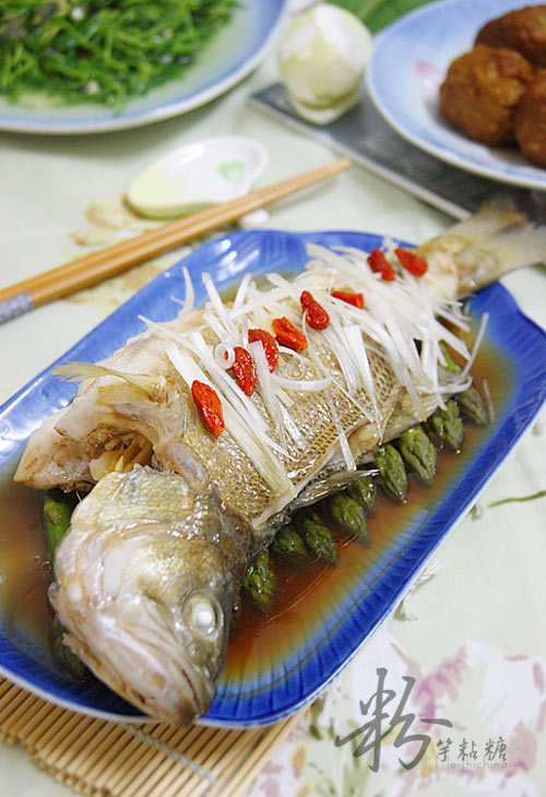 及以下步骤:关火后,蒸好的鲈鱼放上葱丝和枸杞,淋上酱油,虚蒸5分钟取出。 另锅烧明油,将烧热的明油淋在鱼身上即可食用。 原料、调料备好。 鲈鱼洗净沥干水份,将鱼脊骨处切开(防止蒸熟后变形)。 芦笋洗净,大葱、姜切丝,蒜剁茸,枸杞泡发洗净备用。 芦笋切成适合的长段,码入盘中。 将鱼放在芦笋段上,鱼腹内纳入葱、姜丝和蒜茸,鱼身均匀摸上盐,腌制20分钟。 锅内烧开水,把鱼放入,大火蒸7分钟。 关火后,蒸好的鲈鱼放上葱丝和枸杞,淋上酱油,虚蒸5分钟取出。 另锅烧明油,将烧热的明油淋在鱼身上即可食用。