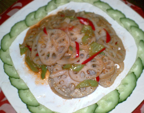 及以下步骤:热锅加水,待水开时下入莲藕,烫至断生,捞出沥干水备用。 莲藕洗净切片,青椒、红椒洗净去籽切菱形状,洋葱切片。 热锅加水,待水开时下入莲藕,烫至断生,捞出沥干水备用。 莲藕洗净切片,青椒、红椒洗净去籽切菱形状,洋葱切片。 热锅加水,待水开时下入莲藕,烫至断生,捞出沥干水备用。 莲藕洗净切片,青椒、红椒洗净去籽切菱形状,洋葱切片。 热锅加水,待水开时下入莲藕,烫至断生,捞出沥干水备用。 热锅烧油,放入青、红椒片和洋葱片,用中火炝香。 加入莲藕片,调入盐、味精、番茄汁炒透入味。 铲入碟中,完成。