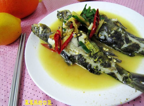 5、鱼炖熟后,加入辣椒丝和葱花。
