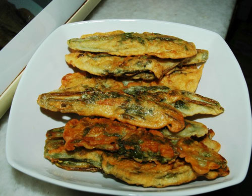 及以下步骤:点火倒油,油适量不要太多。 油开始冒烟儿时就可以用了,香椿均匀沾上面糊下锅。 中小火煎成图的颜色即可。瞧,就这样做好了。 焯好的香椿颜色是绿色的。 焯好的香椿沥水。 面粉、鸡蛋、盐、鸡精、花椒粉、黑胡椒粉和面。 和好的面糊儿是这样的。 点火倒油,油适量不要太多。 油开始冒烟儿时就可以用了,香椿均匀沾上面糊下锅。 中小火煎成图的颜色即可。瞧,就这样做好了。