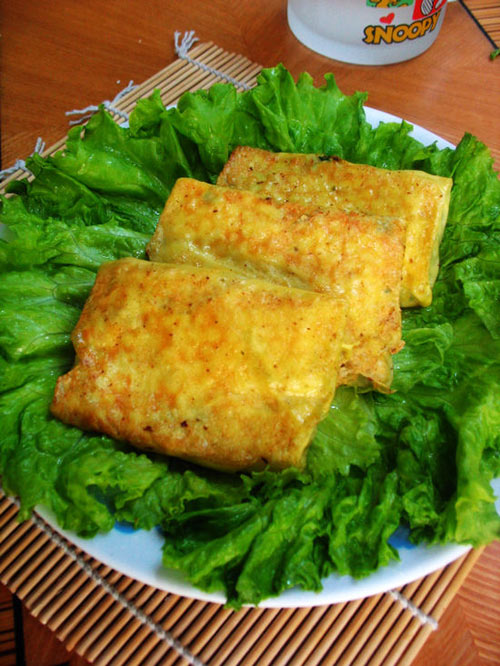 豆腐皮包子是《红楼梦》中一美食,豆腐皮,在武汉叫干张,北方人叫油皮。把不加凝固剂的豆浆煮沸,待其冷却时拿出面上结的一层皮,再晾干就可。 以前我一直认为这豆腐皮和平时的干豆腐是一种呢,其实他们们是完全不同的。干豆腐 干豆腐(gān dòu fu)系东北特产,也叫东北干豆腐,是一种压成薄片状的豆腐制品。它既不同于南方出产的豆腐皮、千张儿,也不同于腐竹和豆腐干。 豆腐皮包子也是包入馅料,然后上锅蒸制而成的,今天我这个是油煎的,主要是我买的豆腐皮太湿了,估计蒸出来外形不能太好。索性把蒸改为煎,好象有点像春卷了哈!就叫他减肥版的包子吧!
