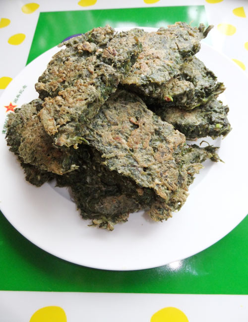 及以下步骤:煎锅中放油,油热后放入白蒿开始煎。 一面煎的成形后用铲子将白蒿铲成小块并翻面。 将两面煎至黄色就可以了。 切好的白蒿放入盆中,加鸡蛋、盐、胡椒粉适量。 放入切好的葱花搅拌。 再放入干面粉。 调成如图的样子。 煎锅中放油,油热后放入白蒿开始煎。 一面煎的成形后用铲子将白蒿铲成小块并翻面。 将两面煎至黄色就可以了。