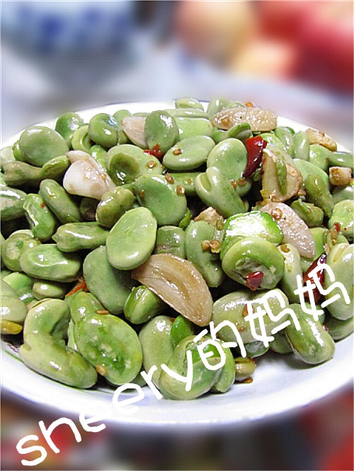 及以下步骤:锅内放油,下蒜片、姜片、干辣椒爆出香味。 放入蚕豆米翻炒。 锅内放油,下蒜片、姜片、干辣椒爆出香味。 放入蚕豆米翻炒。 锅内放油,下蒜片、姜片、干辣椒爆出香味。 放入蚕豆米翻炒。 放点糖炒匀。 盖上锅盖焖15分钟左右至蚕豆熟透。 撒点盐和鸡精调味。 再翻炒一会儿就可装盘了。
