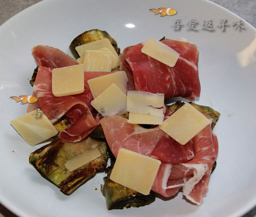 及以下步骤:把它切开两半。 把花骨朵中心的毛去掉。 热油锅倒入少许橄榄油。 把切好的花骨朵下锅排好中火煎5分钟。 朝下的一面成焦黄色就可反面撒上盐和楜椒粉再煎5分钟就可以出锅了。 放置稍凉就可一正一反的排好在盘子上。 然后摆上火腿片。 最后把帕玛森奶酪切成随意状撒在上面就好了。 然后摆上火腿片。 最后把帕玛森奶酪切成随意状撒在上面就好了。