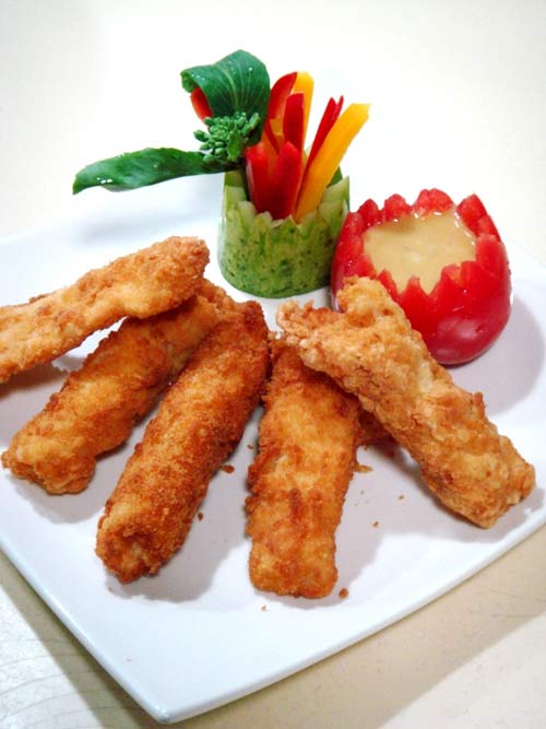 3、建议炸鱼排或鸡排等在码盘时,以立体码盘为好,这样可使其架空保持长时间的酥脆,如平摆,会使鱼排的底部散热不好吃起来发软,底面就失去了酥脆感,立体码盘很简单,就是在盘中横放一只鱼排,把其它的鱼排搭在上面即可,也可以放在竹制的专用小架上,即好做造型,鱼排还可始终保持酥脆。