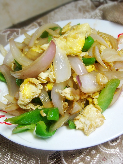 及以下步骤:洋葱和菜椒变软后加一勺盐。 倒入之前炒好的鸡蛋。 加少许酱油调味即可。 洋葱切片备用。 锅内热油炒鸡蛋后盛出备用。 锅内倒入洋葱翻炒。 待洋葱出香味加入菜椒。 洋葱和菜椒变软后加一勺盐。 倒入之前炒好的鸡蛋。 加少许酱油调味即可。