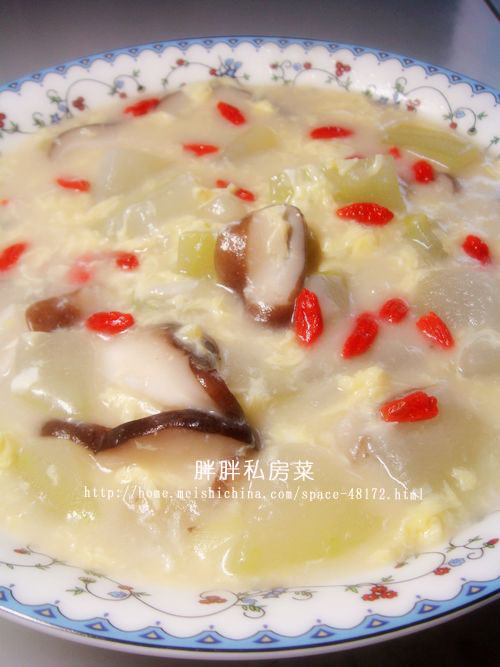 及以下步骤:直到炒出香味来。 添加400毫升水,放入葱、姜、蒜和冬瓜大火烧开。中火烧5分钟。 放入香菇片翻炒。 开锅烧2分钟。 将鸡蛋磕入碗中,搅匀。 慢慢倒入锅中,添加盐、味精、香油调味即可。 把奶汤冬瓜盛入碗中,再把泡发好的枸杞撒到上边。即可享用。 将鸡蛋磕入碗中,搅匀。 慢慢倒入锅中,添加盐、味精、香油调味即可。 把奶汤冬瓜盛入碗中,再把泡发好的枸杞撒到上边。即可享用。