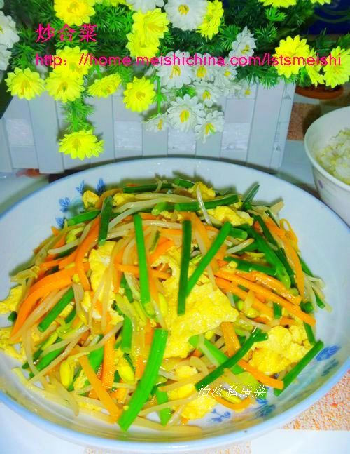 及以下步骤:豆芽入开水中焯熟后捞出过凉水。 鸡蛋入热油锅炒熟备用。 炒锅油热后放入葱姜爆香。 放入胡萝卜翻炒。胡萝卜是含有大量的脂溶性维生素,需要油才能更好的吸收,所有要先下。 然后放入豆芽翻炒。 在放入韭菜翻炒。 在放入生抽和糖翻炒后放入鸡蛋。 加入盐和鸡精,淋上香油,翻炒均匀即可。 翻炒均匀后装盘即可食用。 翻炒均匀后装盘即可食用。
