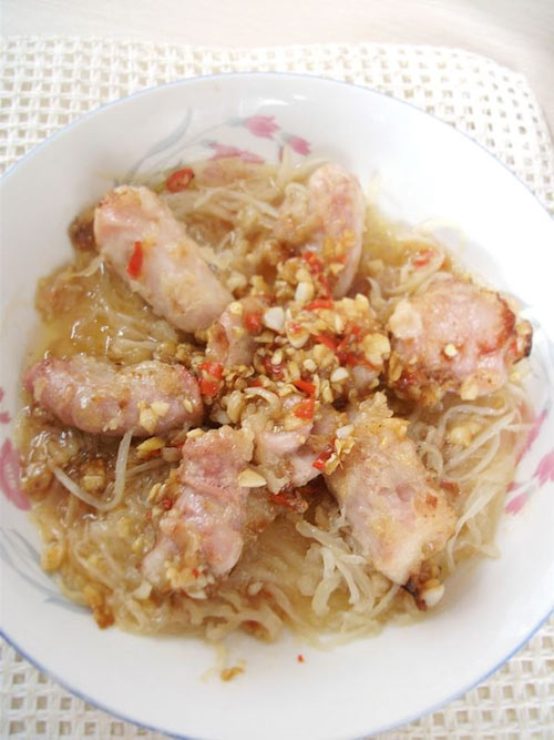 7、炒好的萝卜丝垫底,竹肠铺在面上,将填剩余的调料淋在上面,锅内烧开水,隔水大火蒸十分钟即可。