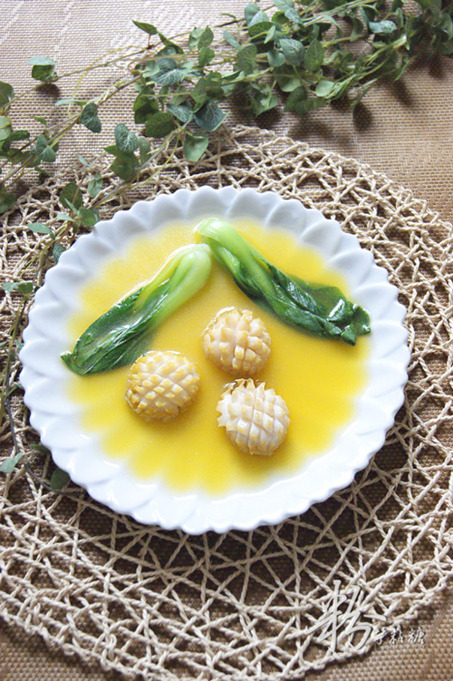 及以下步骤:小棠菜捞起后,再放入鲍鱼焯水,鲍鱼身往内卷即可。 将小棠菜和鲍鱼分别放凉水中。 另锅下油爆姜粒,然后把鲍鱼放入,倒入上汤、2汤匙鲍鱼汁和1/2茶匙盐。 煮两分钟,再盖上盖焖一分钟,让鲍鱼入味。 另起锅倒入南瓜汁、2汤匙鲍鱼汁和1/2茶匙盐。 淋入水淀粉,搅拌均匀,烧至微开即可。 依次将小棠菜和鲍鱼摆入盘中,再淋上南瓜汁。 另起锅倒入南瓜汁、2汤匙鲍鱼汁和1/2茶匙盐。 淋入水淀粉,搅拌均匀,烧至微开即可。 依次将小棠菜和鲍鱼摆入盘中,再淋上南瓜汁。