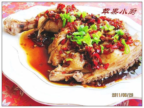 及以下步骤:蒸好的鸡腿放至不烫手,切成大块摆入盘中。 将料汁均匀的浇在上面即可食用。 鸡腿清洗后入加了少许葱、姜、盐、料酒的锅中煮出血水。 将鸡腿捞出放入盘中,抹上少许料酒,放上葱姜。 入锅中蒸至熟烂,用时大约二十五分钟。 葱、姜、红甜椒切成细末。 锅中放适量油,放入葱姜红椒末炒香。 加入酱油、糖、醋烧开,淋入少许芝麻油后关火。 蒸好的鸡腿放至不烫手,切成大块摆入盘中。 将料汁均匀的浇在上面即可食用。