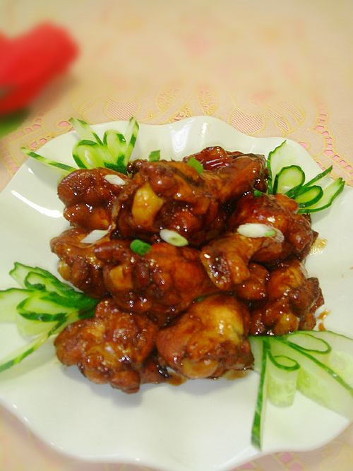 及以下步骤:锅里放油,爆香姜片。 放入翅根中火煎至表皮金黄。 倒入勾兑好的烧汁。 中小火焖至收汁即可上碟,用青瓜结装饰即可。 将青瓜对半切开再斜切五片做成图中的样,摆盘用。 锅里烧水,放入料酒,将鸡翅根飞水冼净。 锅里放油,爆香姜片。 放入翅根中火煎至表皮金黄。 倒入勾兑好的烧汁。 中小火焖至收汁即可上碟,用青瓜结装饰即可。