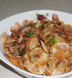 海瓜子,贝壳类,生长于滩涂,肉质细腻,极鲜嫩.做此菜除调味要适当尽量保持原有的鲜味外,更重要的一点是一定要掌握火候,不能炒久了使肉质失去嫩度.