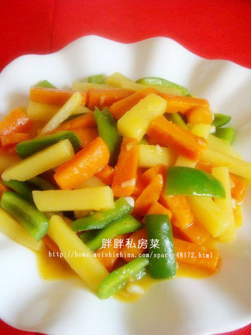 及以下步骤:葱切段、姜切片。 锅里放油,放入葱、姜煸炒出香味。再把葱、姜取出来。 放入胡萝卜翻炒。 放入土豆条翻炒。 放入鸡汤、盐翻炒5分钟。 放入青椒翻炒。 放入水淀粉勾芡,添加香油翻炒均匀即可。 出锅装盘,即可享用。 放入水淀粉勾芡,添加香油翻炒均匀即可。 出锅装盘,即可享用。