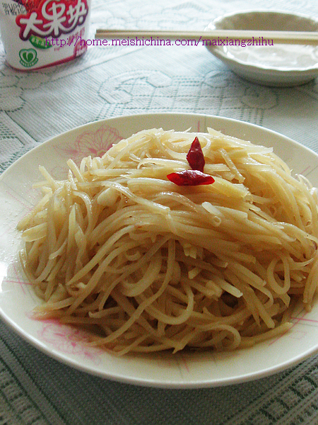 及以下步骤:土豆一个,洗净削皮。 用擦子擦成细丝。 土豆一个,洗净削皮。 用擦子擦成细丝。 土豆一个,洗净削皮。 用擦子擦成细丝。 把土豆丝放入盆里,加入清水没过土豆丝,然后加入一点醋和盐,浸泡五分钟。加醋和盐的目的是为了除去土豆的淀粉和让土豆丝更加爽脆。 加入一勺盐、一勺糖、生抽、少许醋,搅拌均匀。 加少许油,加入辣椒煸一下,然后加入土豆丝。 大火翻炒,然后加入调好的汁,出锅前加入蒜粒。这款土豆丝,味道浓郁,非常好吃。