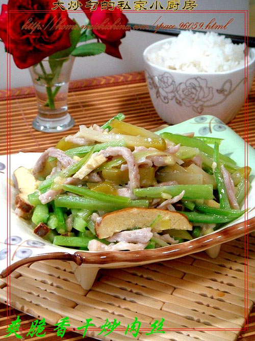 两年前,和几个朋友自驾车从福州去山区玩儿了两天。那次,在当地县城的一家还算不错的饭馆里吃午饭,我让老板看着安排。一桌菜摆上来,看了看,也没啥好吃的!我说;把你们的特色菜炒几个,于是,老板立即让厨师再给添几道菜。时间不大,又端了几盘儿上桌,其中一盘说是叫做双脆香干炒肉丝,听这名儿不错。结果夹起来一吃,原来是西芹榨菜炒肉丝,呵呵!不过,味道还不错。老板说,这道菜客人点的挺多,挺受欢迎的,尝尝吧,看味道咋样! 其实,谁都会炒,呵呵!既然是福建山区小地方算是不错的一道菜,今天咱就炒它,反正是在福建吃的这道双脆香干炒肉丝,也算是闽菜的家常菜吧!其做法如下;
