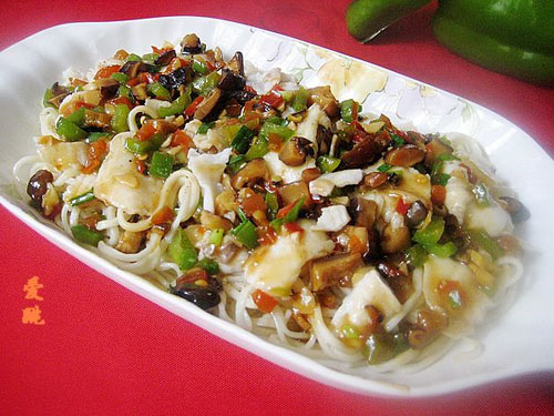 及以下步骤:放入青椒,剁椒煸炒。 放料酒,鲜抽、盐,糖、醋、胡椒粉、麻油,鸡精,再用水淀粉勾芡。 浇在鱼上即可。 面条放开水煮熟,凉凉,用麻油,盐,搅拌好,摊在大盘。 锅里水烧开,将鱼放入大碗,用开水冲入烫片刻。水倒掉,再用开水冲一遍,烫熟。 把鱼片摆在面条上,撒上胡椒粉。 锅里放油,入葱、蒜、香菇煸炒。 放入青椒,剁椒煸炒。 放料酒,鲜抽、盐,糖、醋、胡椒粉、麻油,鸡精,再用水淀粉勾芡。 浇在鱼上即可。