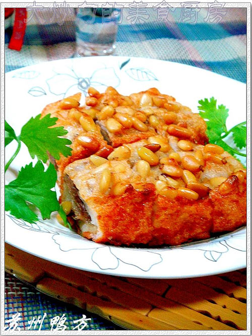 此菜特点;颜色金黄、松子清香、皮脆馅嫩,十分可口。