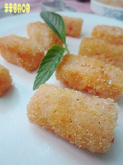 及以下步骤:锅内油七层热,将南瓜条入锅。 两面金黄捞出控油即可。 另配沙拉酱沾食。 切好的南瓜条放入沸水中煮。 煮到8-层熟,用筷子轻轻的可以插出圆孔,但不会碎掉。 煮好的南瓜条拖上蛋液。 两面滚满加了适量糖的面包糠。 锅内油七层热,将南瓜条入锅。 两面金黄捞出控油即可。 另配沙拉酱沾食。