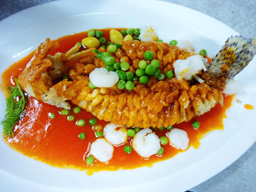 及以下步骤:沥干水分,扑生粉。 入油锅炸熟捞出。 锅上大火,放入少许油,加入清汤,番茄酱,糖,盐,醋调好酱汁,加芡粉勾芡,加少许热油搅匀,浇在鱼身上。 虾仁、青豆、笋丁炒熟撒在鱼身上。 两侧的鱼肉剞菱形花刀。 把剞好花刀的鳜鱼放入葱姜盐水中浸泡一会。 沥干水分,扑生粉。 入油锅炸熟捞出。 锅上大火,放入少许油,加入清汤,番茄酱,糖,盐,醋调好酱汁,加芡粉勾芡,加少许热油搅匀,浇在鱼身上。 虾仁、青豆、笋丁炒熟撒在鱼身上。