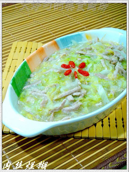 苏菜中的烂糊也叫做肉丝烂糊。此菜,源自江淮河上民间船菜的一道不起眼的小炒,但其味道好,已流传了上百年。 苏菜被列为中国八大菜系之后,特把此菜烂糊收列为最具地域特色的一道另类小炒的代表之作。 烂糊,实际就是肉丝炒白菜,但它的名气却同苏菜中的蟹黄扒白菜享受着同等的名气。从饮食文化历史发展的角度来看,甚至胜过蟹黄扒白菜,因为它的历史更为悠久! 烂糊做法极其简单,就像普通的肉丝炒白菜类似,只不过又延时焖制了几分钟,使白菜吃起来十分软烂,极易吸收消化,它最适合老年人食用,因此起名为烂糊。 一道菜,它只有具备了深度的文化历史内涵,才具有生命的延续。这道菜,据说其典故是;在清代中期的一位孝顺的儿媳,看到公婆牙口不好,为公婆所特意别出心裁制作出来的一道烧菜,此儿媳细心侍奉老人的美德,在当地口碑极好,人们深为感动,年轻人便一一效仿,特为当地老年人制作出了许多烂糊可口的饭菜,也传承了中华民族敬老爱幼的良好品德。下面就把这道菜介绍给大家,其做法如下;