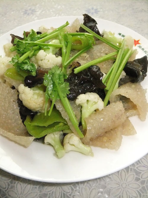 1、皮肚洗净,在沸水中焯一下,菜花摘成小朵,同样焯一下水,青椒切段,木耳摘小朵备用。
