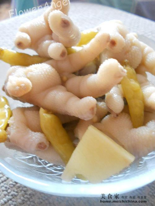 及以下步骤:7.鸡爪捞出洗净放一玻璃大碗里。 8.将泡椒及里面的泡椒水,姜片,盐,适量水倒入装有鸡爪的玻璃碗中,稍微搅拌均匀,入冰箱冷藏1-2天。 9.泡好的凤爪,很好吃呢。 3.对半将鸡爪切断。 4.姜去皮切小片备用。 5.准备好泡椒放一小碗里备用。 6.鸡爪放锅里煮10分钟,大概9层熟。 7.鸡爪捞出洗净放一玻璃大碗里。 8.将泡椒及里面的泡椒水,姜片,盐,适量水倒入装有鸡爪的玻璃碗中,稍微搅拌均匀,入冰箱冷藏1-2天。 9.泡好的凤爪,很好吃呢。