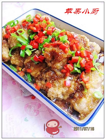 及以下步骤:出锅时撒葱花,红椒末进行点缀。 肋排切成3厘米左右长的段,加盐、酱油、鸡精腌半个时。 将腌好的排骨粘满米粉。 肋排切成3厘米左右长的段,加盐、酱油、鸡精腌半个时。 将腌好的排骨粘满米粉。 排骨全部粘好米粉,再撒上一层米粉稍稍拌匀。 在排骨上淋上橄榄油,入蒸锅,大火蒸上四十到六十分钟。 将酱油、蚝油加水调成碗汁。 蒸排骨时分三次开锅洒上碗汁,并翻动一下,以便排骨入味。 出锅时撒葱花,红椒末进行点缀。