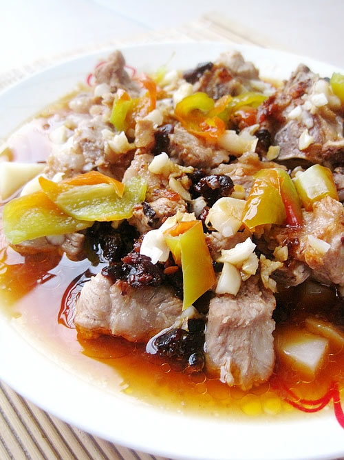 及以下步骤:撒上一层蒜米。 青椒切段撒上层。 倒上少许蚝油。 蒸锅内烧水,上气后放入排骨蒸10分钟即可。 倒上腌制好的排骨。 加两勺香辣豆豉。 撒上一层蒜米。 青椒切段撒上层。 倒上少许蚝油。 蒸锅内烧水,上气后放入排骨蒸10分钟即可。