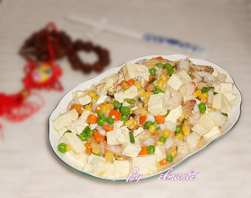 及以下步骤:豆腐放开水里汆烫2-3分钟。 倒出沥干水份 热油锅,把一半葱花爆香。 放入虾米和瑶柱炒出香味,然后倒入鸡汤煮约3-4分钟。 放入虾仁鱼丁,玉米,青豆,胡萝卜丁和冬菇丁继续煮3分钟左右。 倒入豆腐,放盐糖调味,继续煮2分钟。 用淀粉水勾芡即可。 豆腐嫩滑,鲜香可口。 用淀粉水勾芡即可。 豆腐嫩滑,鲜香可口。