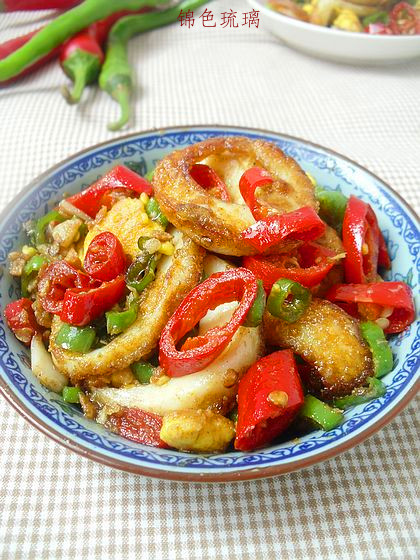 及以下步骤:锅底留少许底油,将辣椒和蒜小火爆香。 倒入炸好的鸡蛋块,轻轻翻炒。 撒入适量盐,几滴酱油,翻匀即可出锅。 表面撒少许生粉,这样可以让蛋黄在炸制的过程中不易脱落。 锅中放适量油,油热后将鸡蛋轻轻推进去,中火炸制,一面炸好后再轻轻翻面。 炸至表面焦黄的时候将鸡蛋捞出。 青红辣椒切小段,蒜切片。 锅底留少许底油,将辣椒和蒜小火爆香。 倒入炸好的鸡蛋块,轻轻翻炒。 撒入适量盐,几滴酱油,翻匀即可出锅。