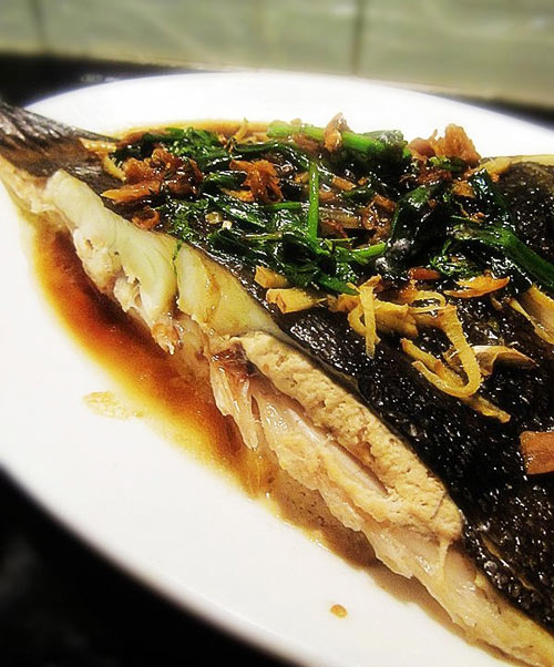 这是继昨天那条大左口鱼之一鱼两味之冬菜蒸左口鱼,由于鱼太大必须切成两半,鱼尾红烧,鱼头部分就蒸着吃,各有各风味。