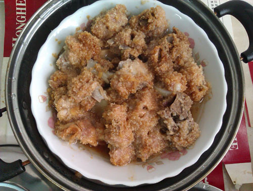 5、腌好的排骨放上蒸菜的米粉,不要有腐乳汁的那种