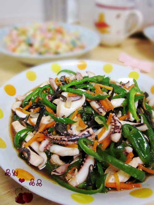 青椒(2个) / 胡萝卜(半根) / 黑木耳(10朵) / 鱿鱼(1只)
